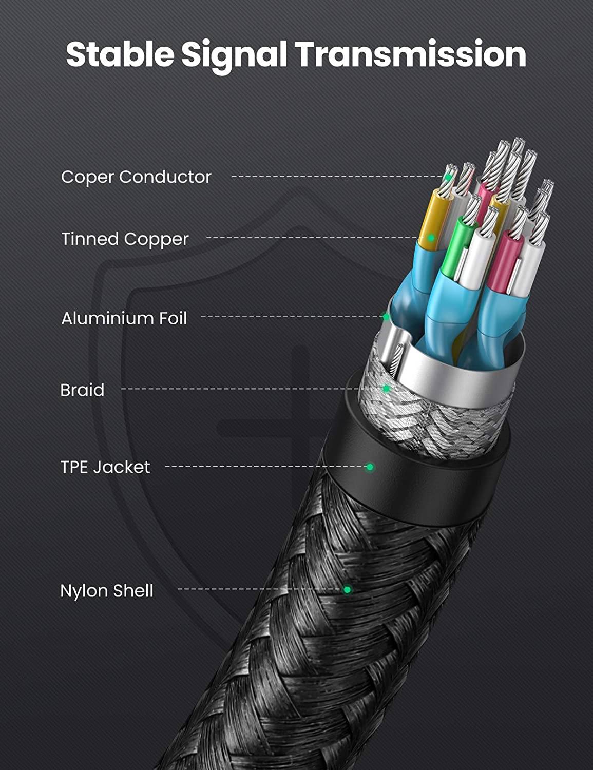 Dây dẫn đồng, nhiều lớp lá chắn bảo vệ chống nhiễu, dây dù bện mềm mại không gãy gập