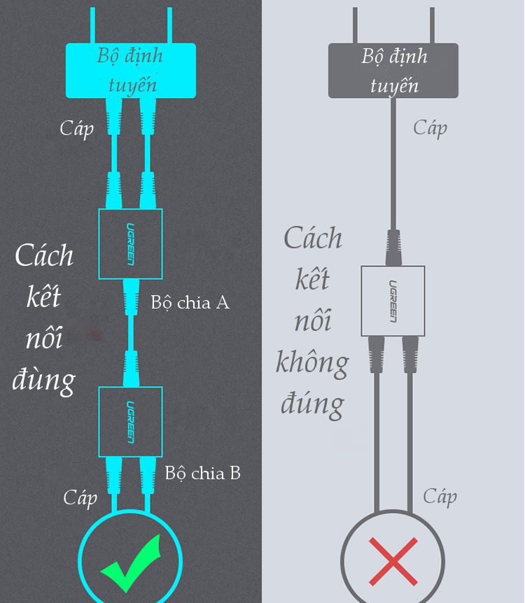 - * Lưu Ý: Cần phải cắm cả 2 cổng: IPTV và LAN trên modem vào bộ chia A thì mới có thể sử dụng được cả 2 chức năng IPTV và internet ở đầu ra của bộ chia B.
