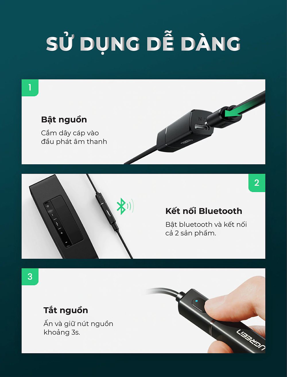 Chất lượng, tiện ích và tính năng cao cấp – Bộ phát âm thanh Bluetooth 5.0 UGREEN CM150 là lựa chọn hoàn hảo cho mọi nhu cầu âm thanh của bạn.