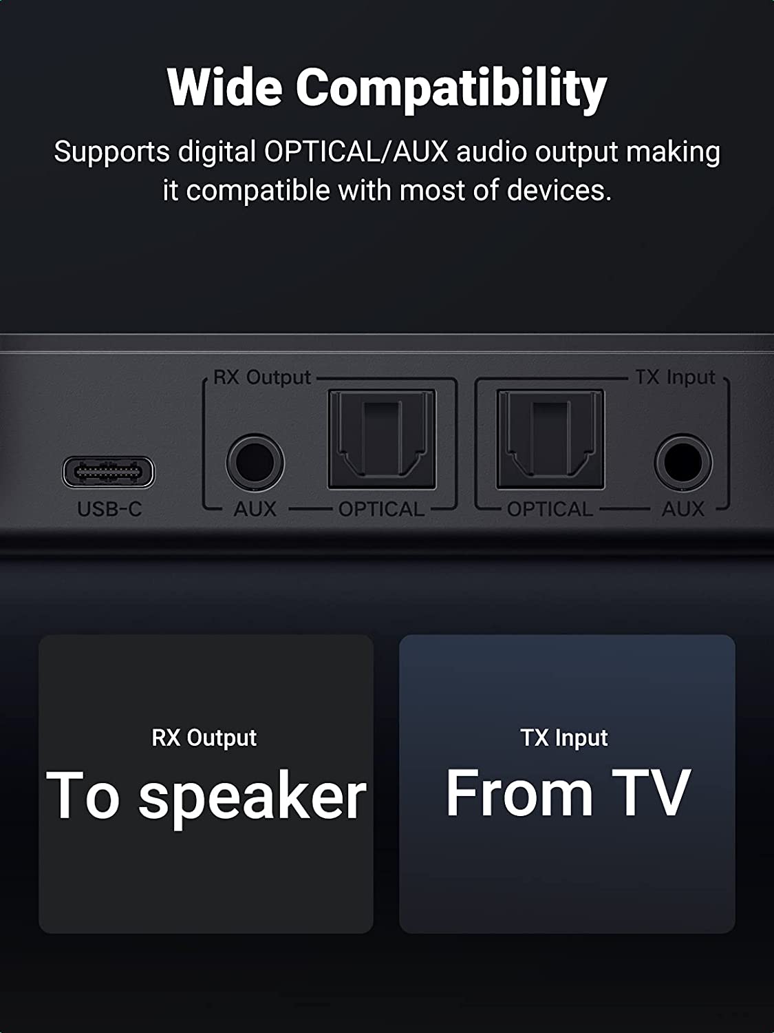 - Ở chế độ TX hoạt động với bất kỳ TV nào có cổng đầu ra âm thanh và nó có thể được ghép nối với bất kỳ tai nghe / loa nào được bật chế độ Bluetooth