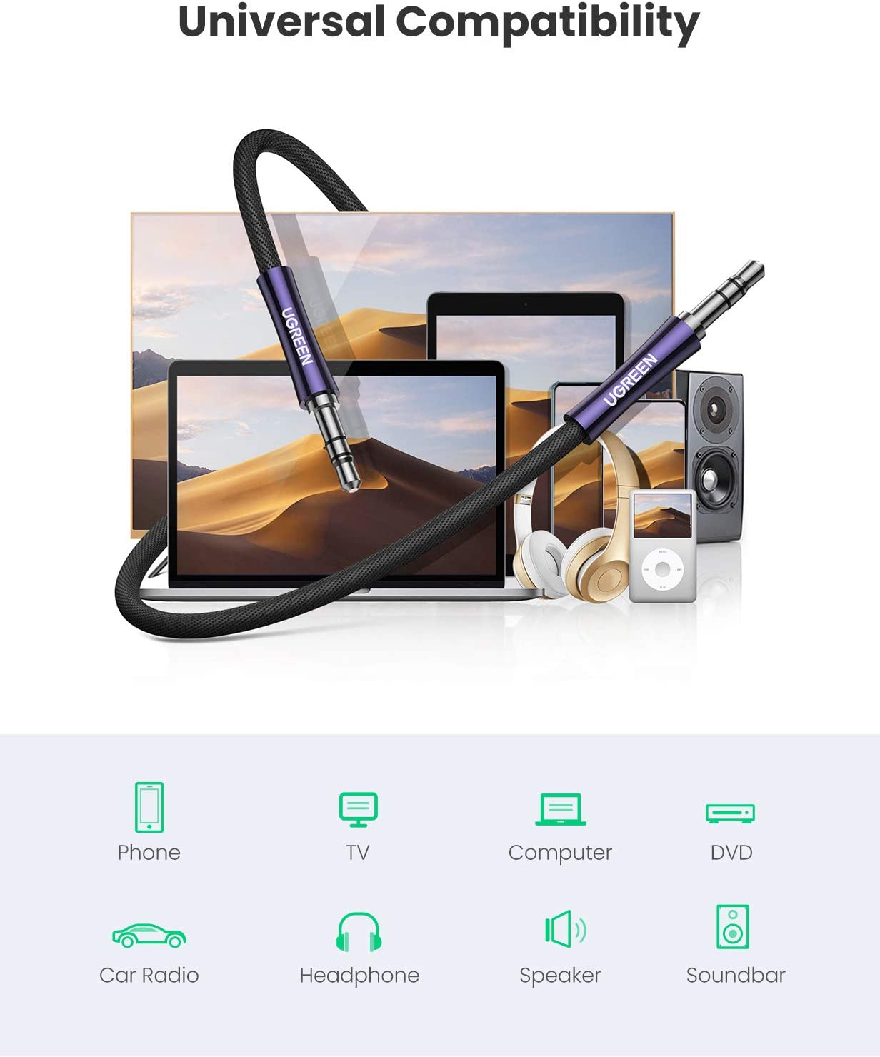- Tương thích với tất cả các thiết bị hỗ trợ đầu 3.5mm như: iPhone 6S/6S Plus/6/6 Plus/SE/5S, iPod, iPad 2018(6th generation)/2017, iPad 4/mini 4/Air 2/Pro 10.5", Samsung Galaxy Tab E 9.6"/8.0"/Lite 7.0"/Tab S2/S4/3, S10/S10 Plus/S9 Plus/S8/S8/S8 Plus/Note 9/Note 8/S7/J3, A8/A5 2018/2017, Huawei Y9(2019), tablets, PC, compatible with audio output devices like Bose, Logitech, Sony, Samsung, Apple headset, portable speaker, car or home aux stereo, surround TV…