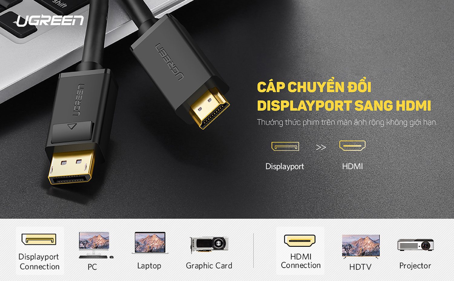 Cáp chuyển đổi DisplayPort sang HDMI UGREEN DP101 hay DP to HDMI 4K thế hệ mới hỗ trợ độ phân giải lên tới 4K@30Hz