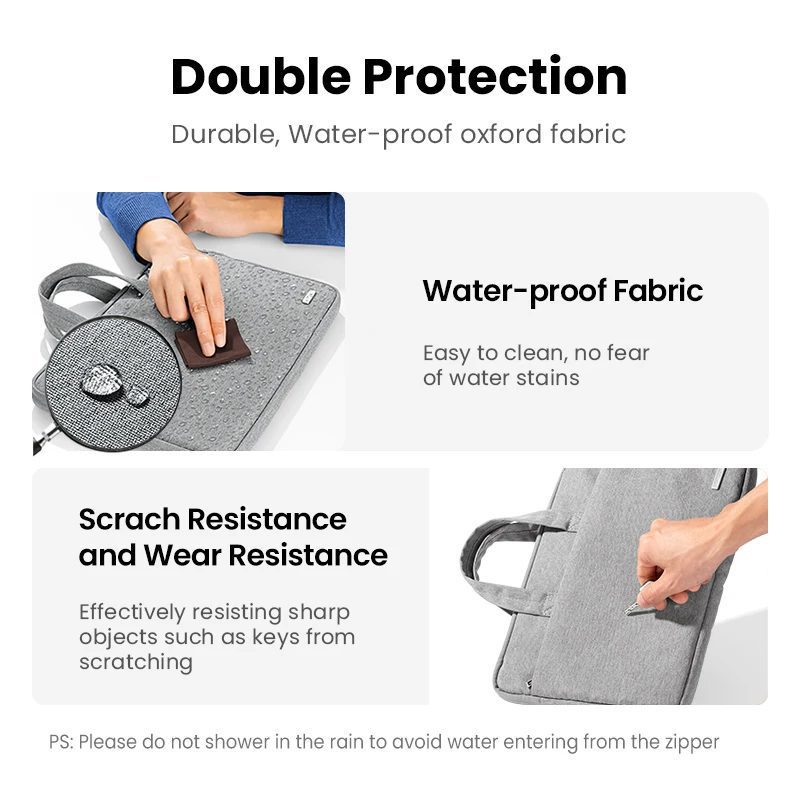 Túi đựng laptop UGREEN có tay cầm có thể giấu, dễ dàng chuyển đổi giữa túi xách tay và túi lót. Thiết kế đa năng này cho phép bạn mang túi theo nhiều cách khác nhau, tùy theo sở thích và nhu cầu của bạn. Dù bạn muốn cầm như một chiếc cặp hay gắn vào tay cầm của vali, túi này mang lại sự tiện lợi và linh hoạt tối đa.