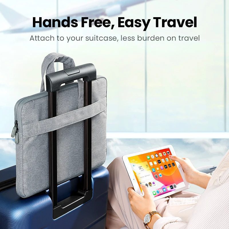 Cặp laptop chống sốc UGREEN LP516 Được thiết kế với người du lịch hiện đại trong tâm trí, túi đựng laptop UGREEN có thể dễ dàng gắn vào vali của bạn, giúp việc di chuyển qua các sân bay đông đúc hoặc đường phố bận rộn trở nên dễ dàng hơn. Bằng cách gắn nó vào vali, bạn có thể phân bố trọng lượng đều và giảm bớt gánh nặng cho vai. Tận hưởng trải nghiệm du lịch không tay và thoải mái với túi đựng laptop được thiết kế chu đáo này.
