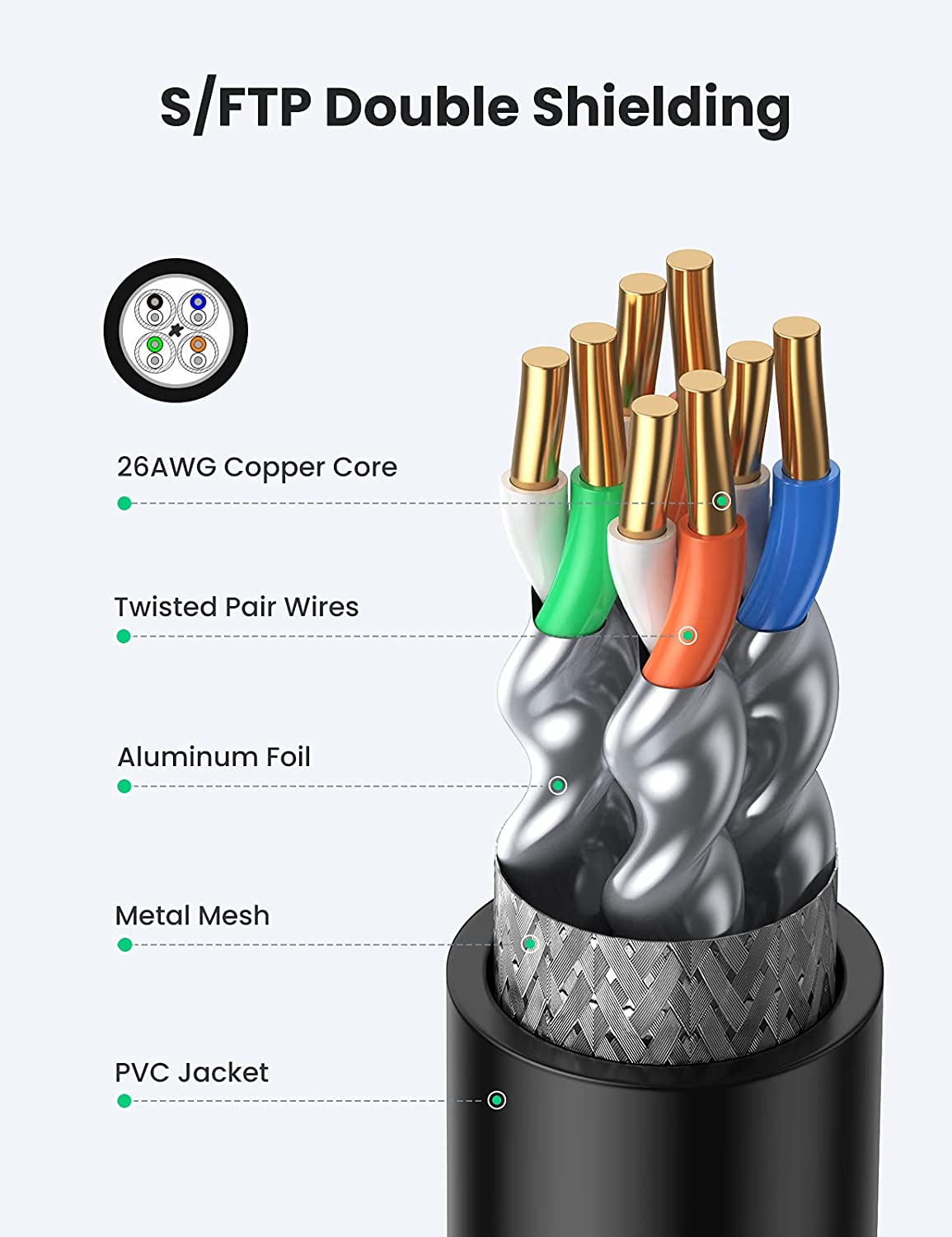 Cáp mạng mở rộng Ethernet UGREEN Cat 8 được thiết kế với 4 cặp xoắn lá được bảo vệ và một lớp bảo vệ lưới kim loại bên trong (S / FTP).