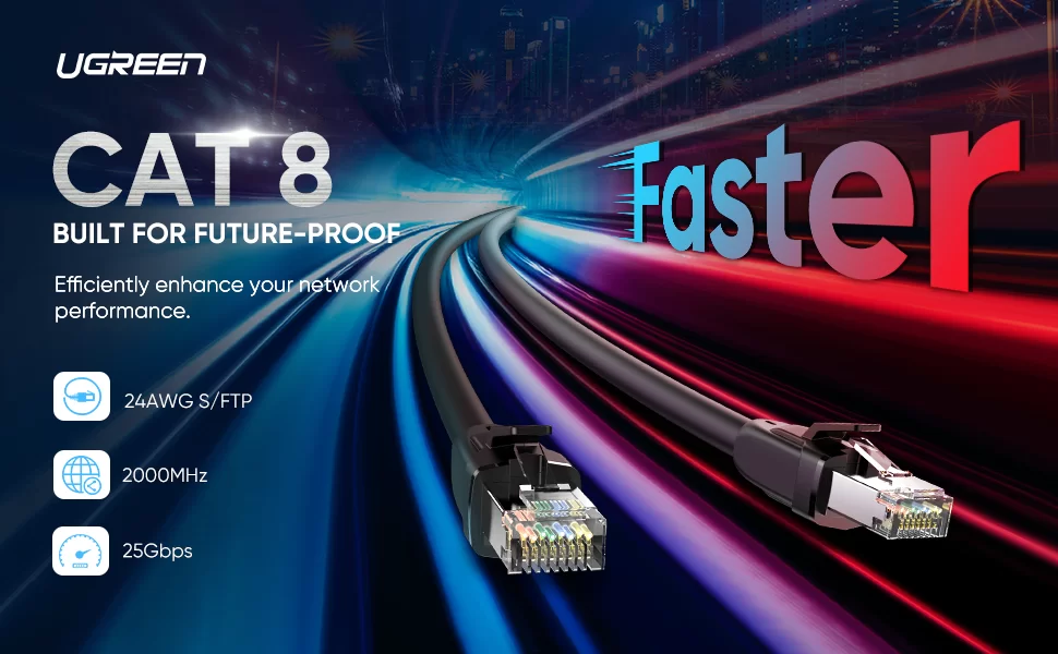 Cáp mạng Cat8 UGREEN NW121 mang đến trải nghiệm truyền dữ liệu tốc độ cao, dây cáp mạng Cat 8 với đầu RJ45 không chỉ tốc độ nhanh hơn gấp 250 đến 400 lần so với cat5 mà còn tương thích hoàn toàn với các chuẩn cũ như Cat 7, Cat 6, Cat5 và Cat5e.