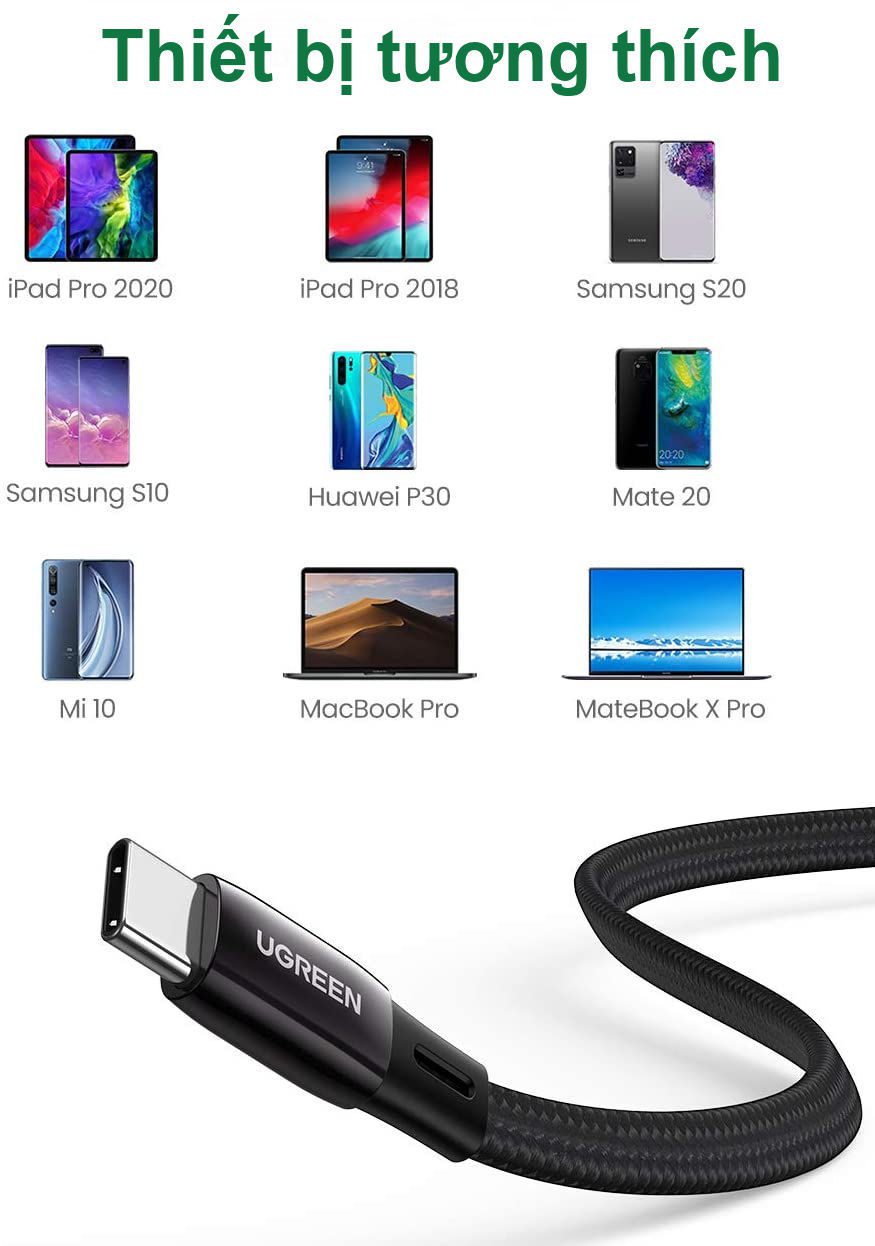 Cáp UGREEN US331 có thiết kế bền bỉ với lớp vỏ bọc dù nylon, giúp tăng độ bền và khả năng chịu lực khi sử dụng hàng ngày. Ngoài ra, nó cũng được trang bị các tính năng an toàn như bảo vệ quá dòng, quá áp, giúp đảm bảo an toàn cho thiết bị trong quá trình sạc. Cáp này tương thích với nhiều thiết bị khác nhau như MacBook, iPad, Samsung Galaxy, Xiaomi, và nhiều thiết bị khác.
