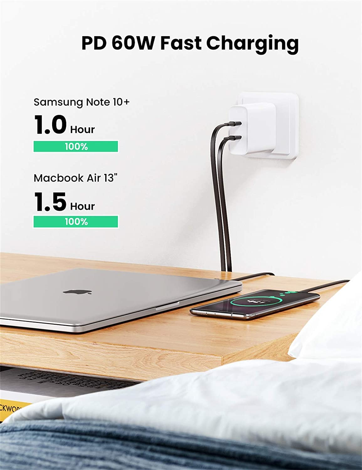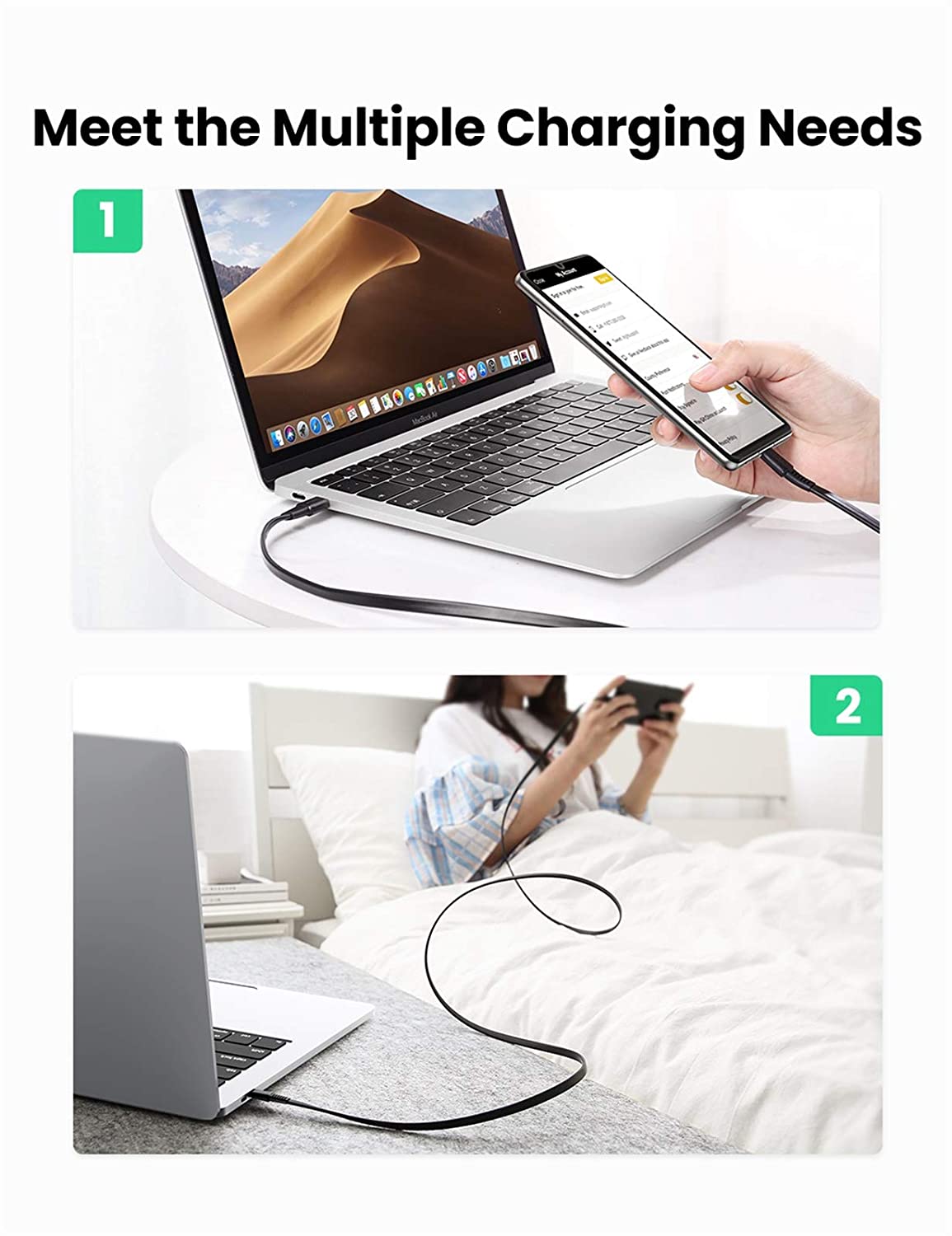 Cáp sạc nhanh UGREEN US333 với hai đầu USB Type-C, công suất lên đến 60W, hỗ trợ sạc nhanh cho hầu hết các thiết bị như MacBook Air 13″, MacBook Pro 2020, Dell XPS, Lenovo ThinkPad, Surface Book 3, Asus ZenBook, Huawei MateBook và nhiều dòng máy tính xách tay khác. Với khả năng sạc đầy MacBook Air 13 chỉ trong 1.5 giờ, đây là lựa chọn tối ưu cho người dùng cần sạc nhanh, tiện lợi.