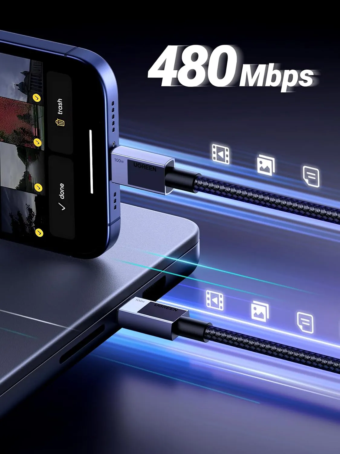 Không chỉ hỗ trợ sạc nhanh, cáp sạc Ugreen L512 còn cho phép truyền dữ liệu tốc độ cao lên đến 480Mbps. Bạn có thể nhanh chóng chuyển các tập tin, hình ảnh và video mà không lo lắng về chất lượng hay tốc độ truyền tải.
