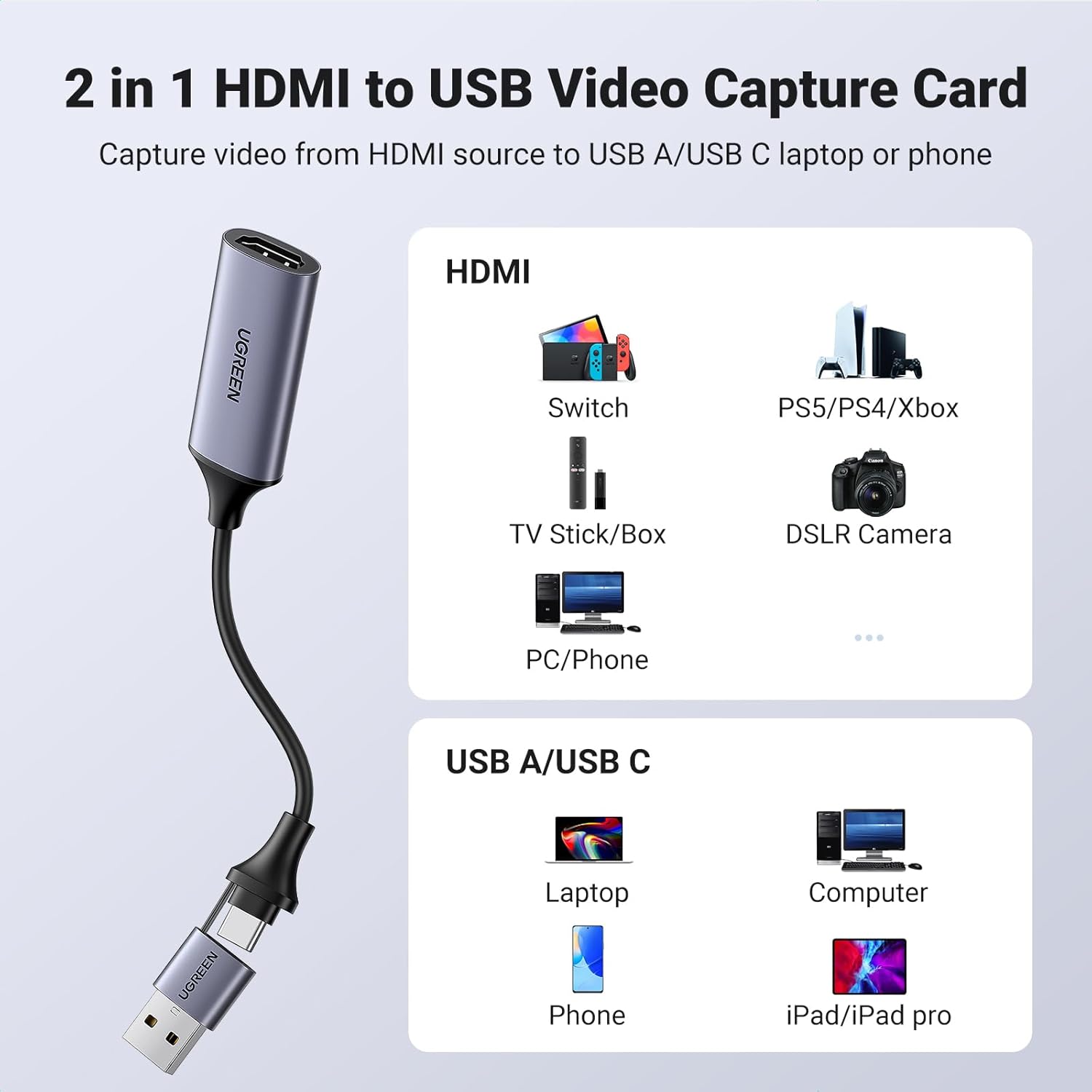Card Ghi Hình LiveStream Ugreen CM489 được trang bị cổng giao diện kép USB-A & USB-C, giúp tương thích với hầu hết các thiết bị hiện nay như laptop, máy tính bảng, điện thoại di động, camera và webcam. Bạn có thể sử dụng sản phẩm này cho nhiều mục đích khác nhau như phát sóng trực tiếp, ghi hình game, hội nghị video, hoặc dạy học.