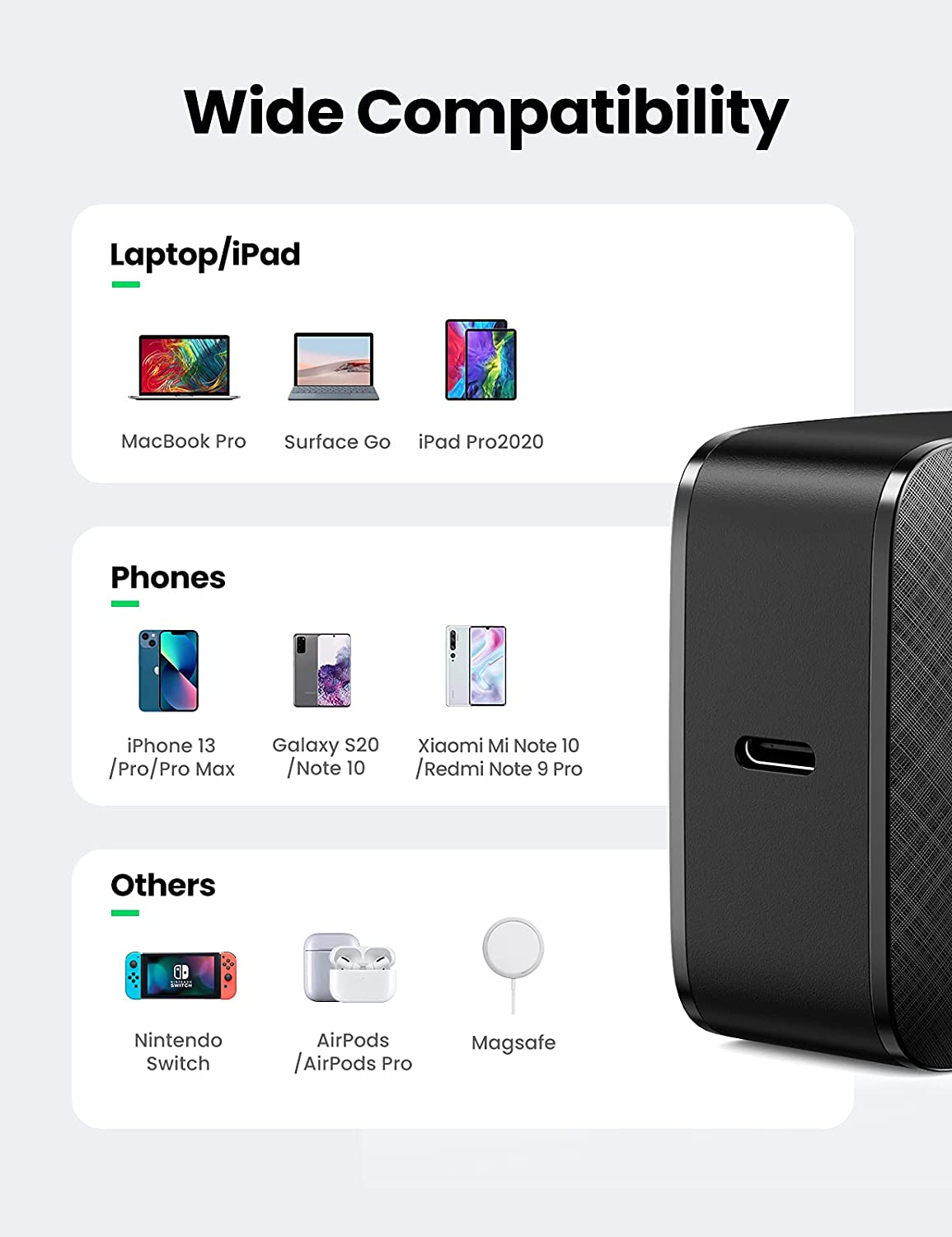 - Khả năng tương thích cao: MacBook Pro/MacBook Air, HP, Samsung Galaxy Note20 Ultra/Note20/S21/S20/S10, AirPods, iPhone 12 Pro Max/12 Mini/SE/iPhone 11/11 Pro/11 Pro Max/XR/XS/8, iPad Pro, Google Pixel, Nintendo Switch…