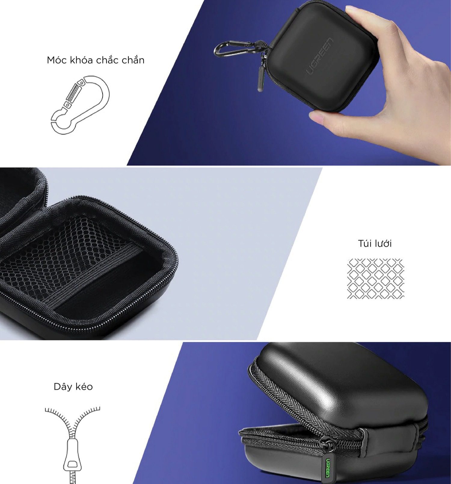 - Được thiết kế với lớp vỏ cứng chống nước và lớp lót bên trong mềm, bảo vệ tai nghe hoặc các thiết bị nhỏ của bạn do bị rơi hoặc bị ướt trong ngày mưa.