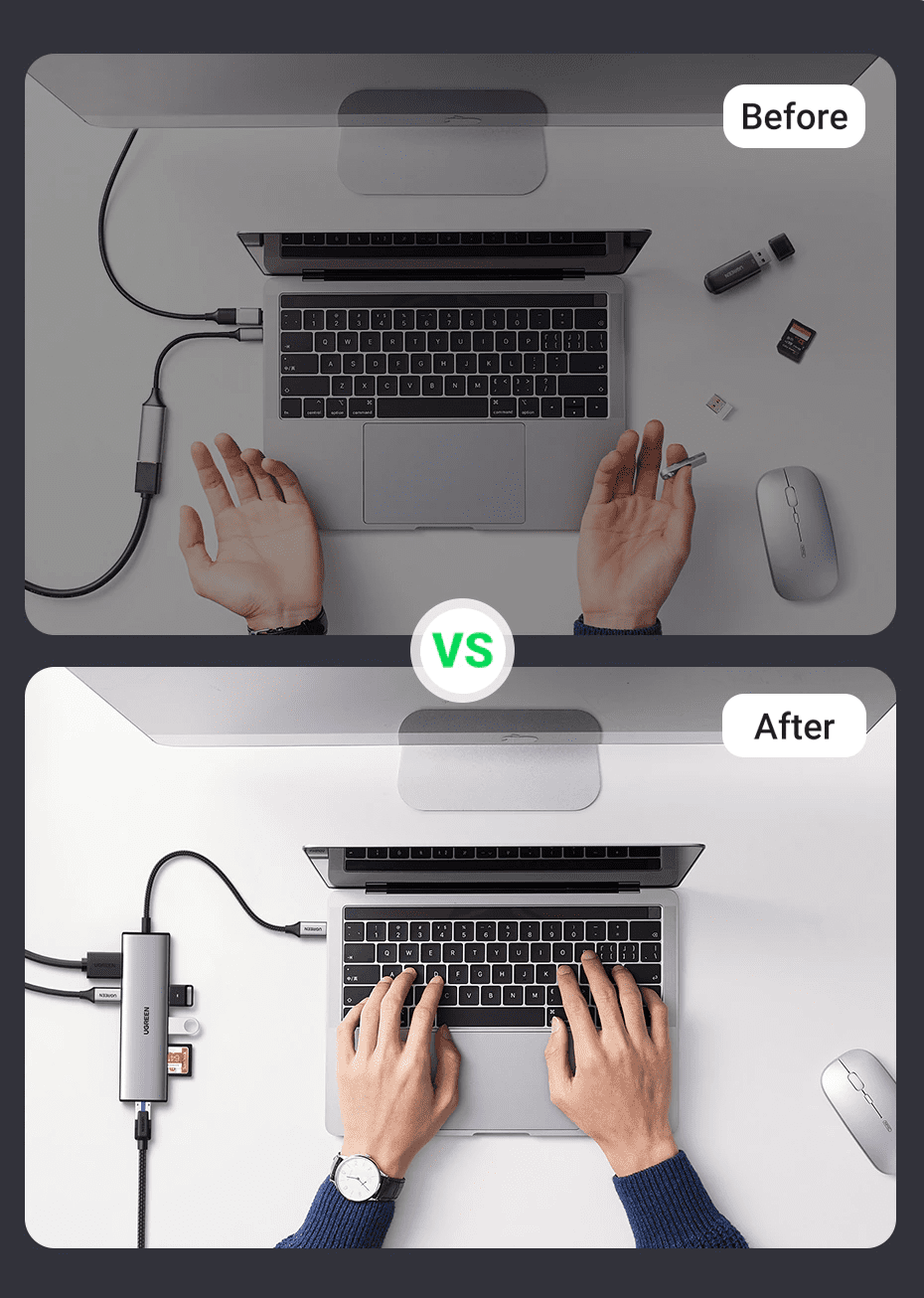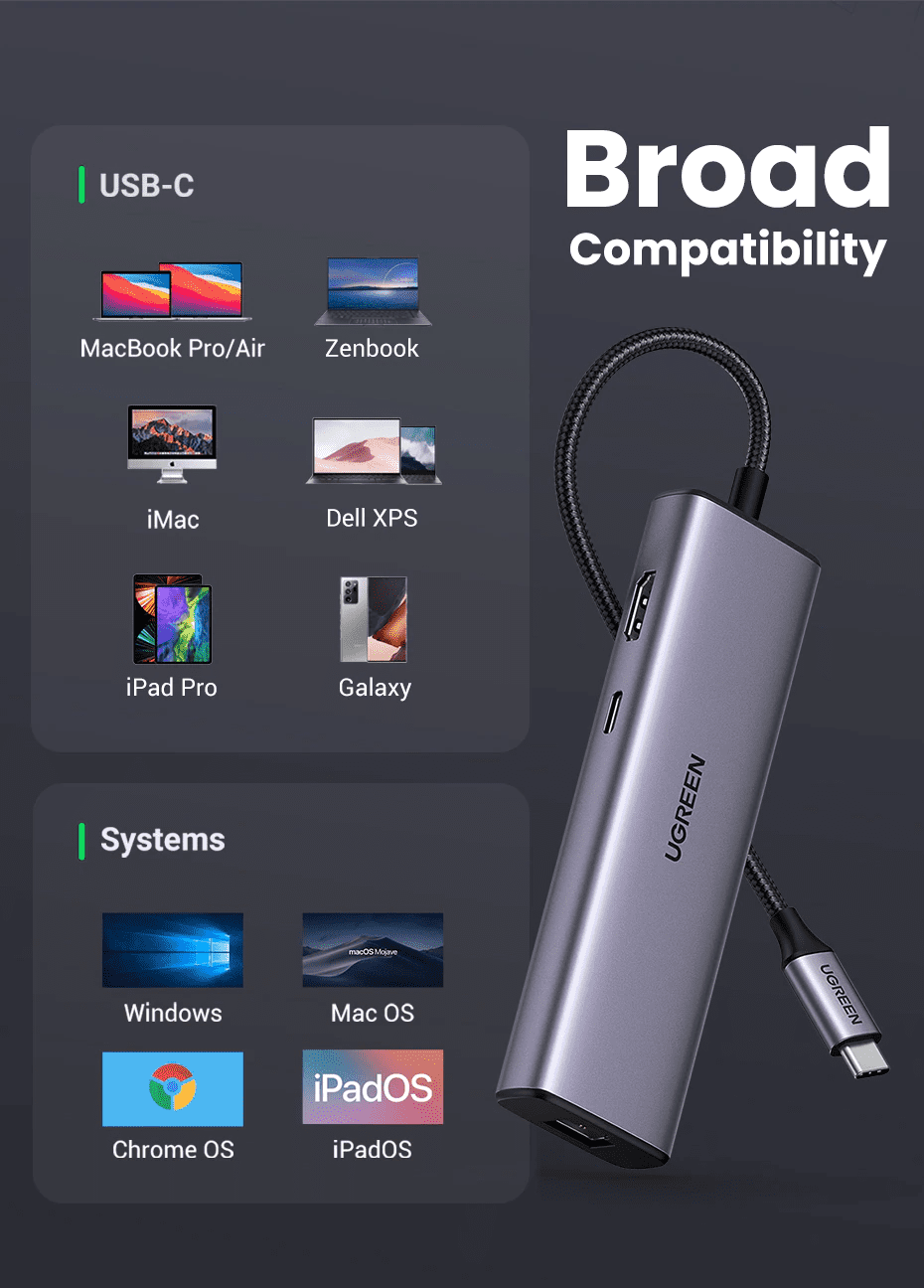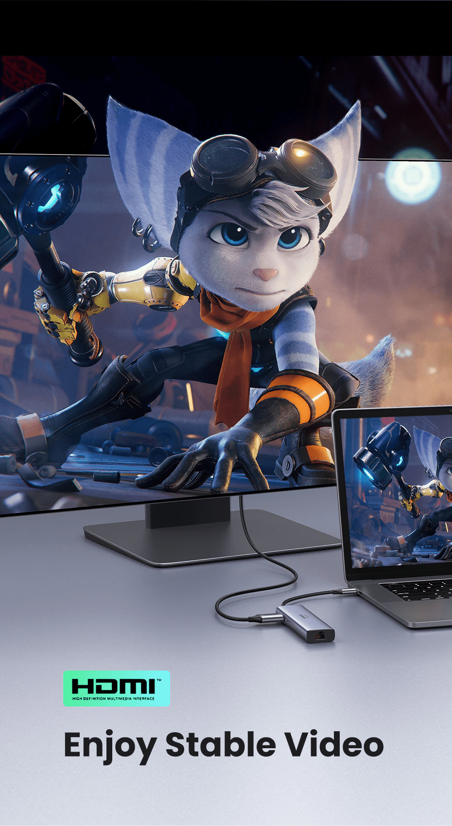 Bộ chia USB-C Ugreen 90568 đi kèm với cổng HDMI, có thể kết nối máy tính xách tay của bạn với màn hình hoặc màn hình để truyền video ít bị lag hoặc giật hơn, hiển thị một thế giới sống động cho bạn