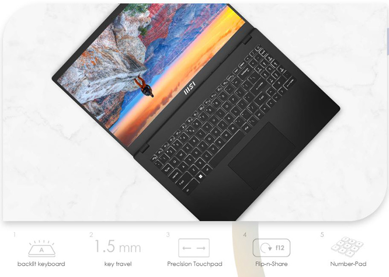 ![]() | Gõ phím thoải mái và dễ chịu Hành trình phím 1.5mm cùng với độ phản hồi tốt giúp đem tới trải nghiệm gõ phím tuyệt với trên Modern 15 B7M. Bàn phím có đèn nền cực sáng, cho phép bạn dễ dàng nhận diện ngay cả trong môi trường tối. |