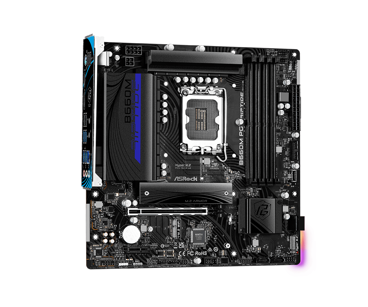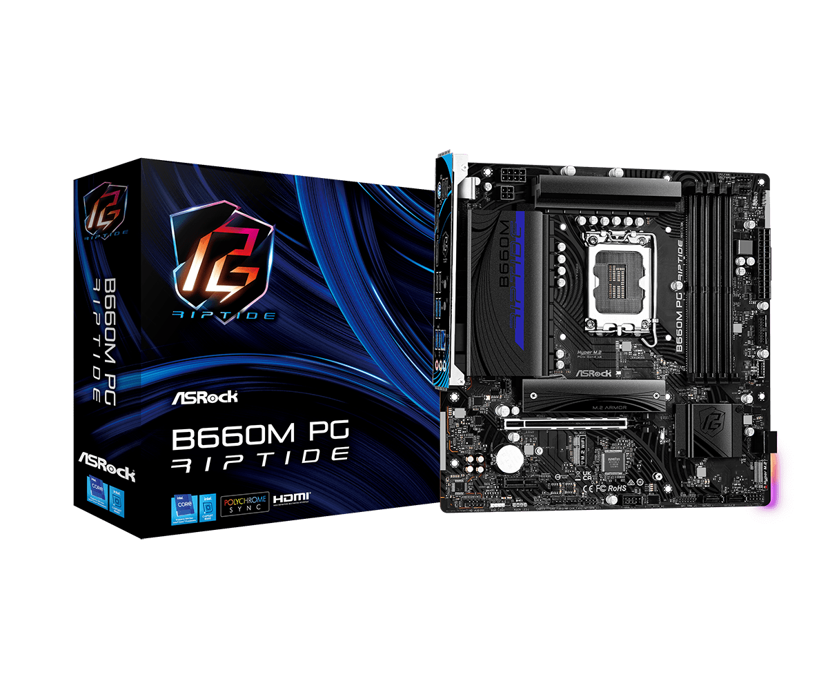 ASROCK đặt cái tên Riptide theo một loại dòng nước trên đại dương như muốn khẳng định sản phẩm ASROCK B660M PG Riptide mạnh mẽ, liền mạch như dòng chảy của dòng nước. Từ vỏ ngoài với tông màu xanh đen cho tới PCB đều có hoa văn dạng sóng nước thể hiện triết lí thiết kế mới mẻ, đặc trưng mà hãng định hướng cho sản phẩm.