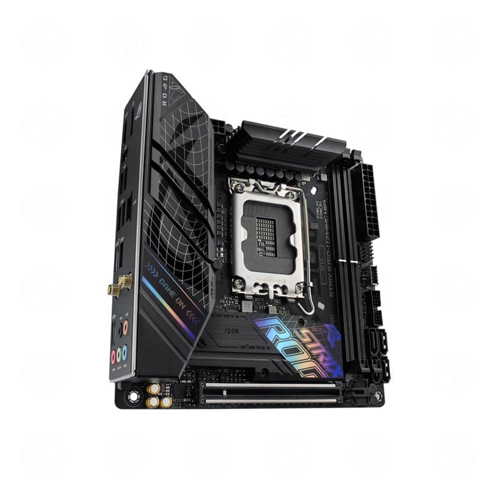 Trong các hệ thống nhỏ gọn trang bị card đồ họa gắn theo chiều dọc, ROG Strix B760-I ẩn mình khiêm tốn, chỉ nhận thấy được các decal họa tiết lưới gợn sóng. Nhưng nếu dàn máy có nhiều không gian hơn một chút, một cặp logo ROG đặc trưng sẽ hiện lên, tạo thành một nét tinh tế đầy màu sắc giữa khung cảnh ẩn mình trong bóng đêm.