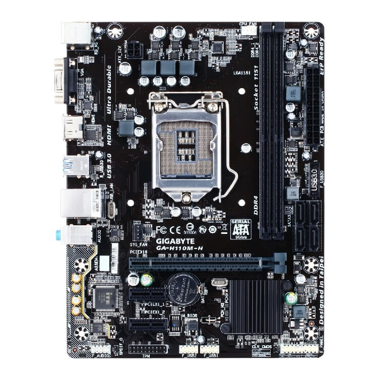 Mainboard GIGABYTE H110M-H hỗ trợ bộ vi xử lý Intel ® Core thế hệ thứ 6 mới nhất. Một CPU máy tính để bàn 14nm có hiệu suất được cải thiện. Tiết kiệm năng lượng và hỗ trợ bộ nhớ DDR4. Mang lại các tính năng vượt trội và hiệu suất tối ưu cho phiên bản PC tiếp theo của bạn.