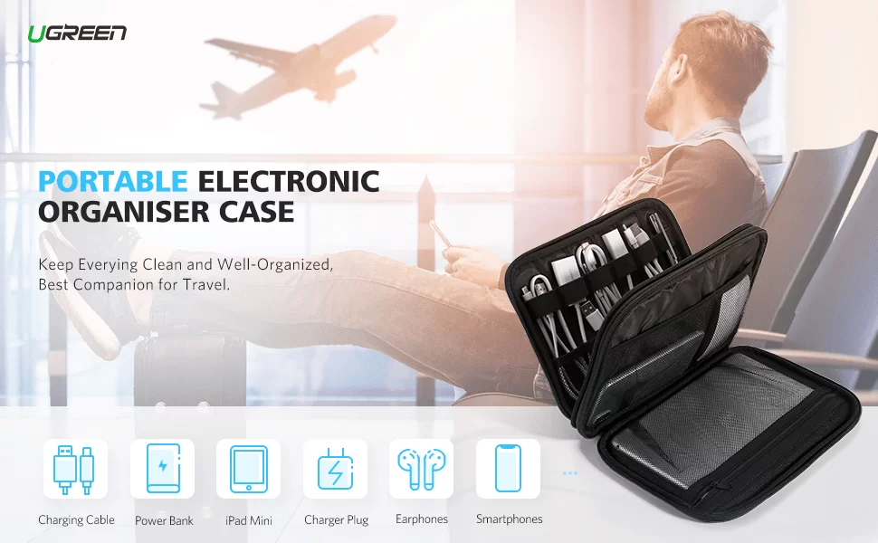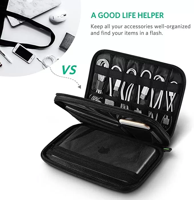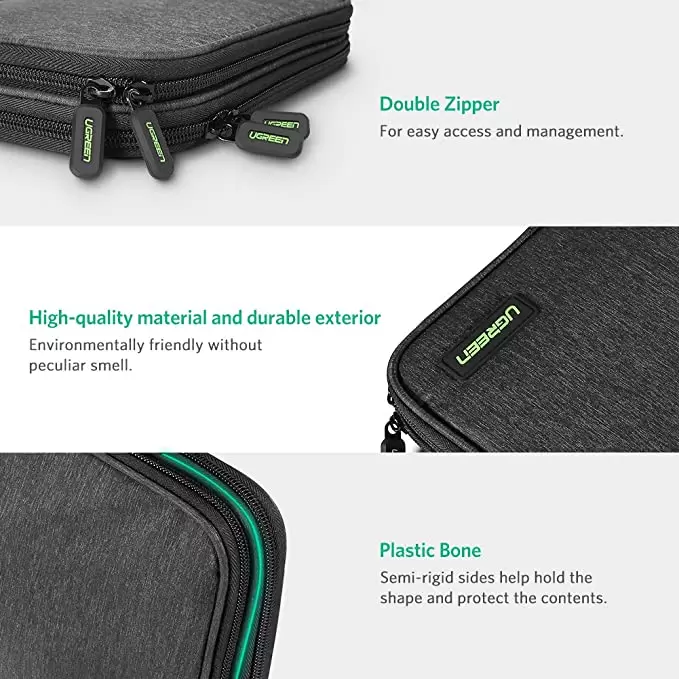 - Thiết kế thông minh: Túi có nhiều ngăn lưới và ngăn có khóa kéo giúp bạn phân loại và bảo quản các phụ kiện như cáp sạc, tai nghe, bút stylus, thẻ nhớ… một cách khoa học.