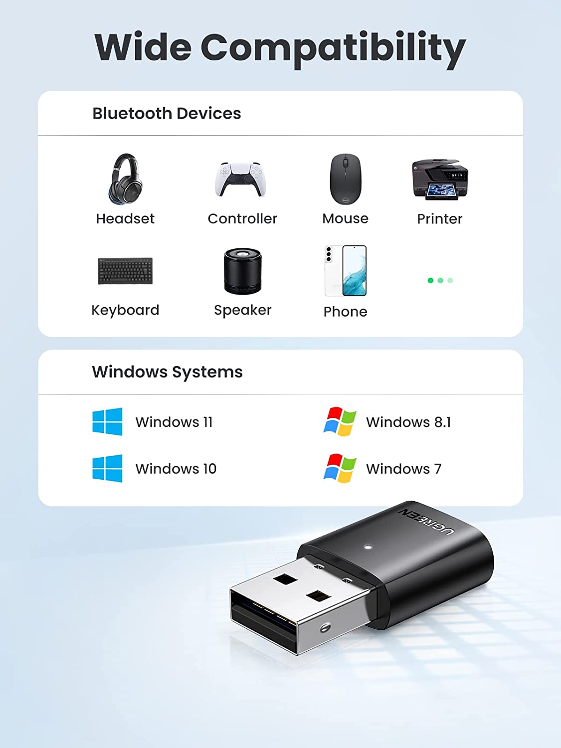 USB Bluetooth Ugreen 80889 – Thu phát Bluetooth 5.0 chỉ tương thích Windows 11,10, 8.1, 7 32/64 bit